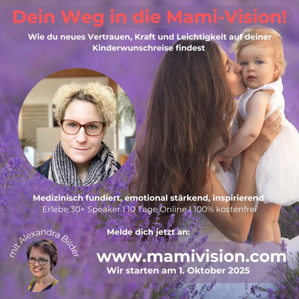 Vom 1.–10. Oktober finden die Mami-Vision-Days statt – ein kostenfreier Online-Kongress mit über 30 Expert:innen aus Medizin, Coaching und Therapie. Gefüllt mit Wissen, Erfahrungen und wertvollen Impulsen für Sie und ggf. auch Ihren Partner/ Ihre Partnerin.